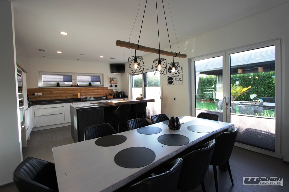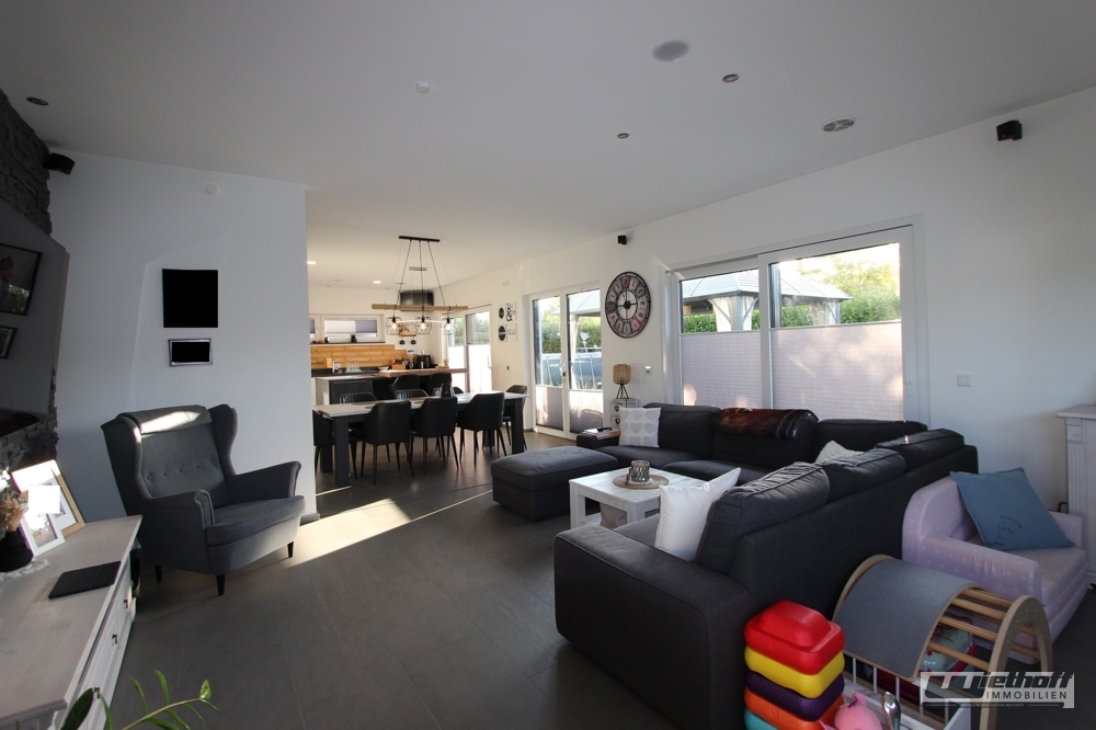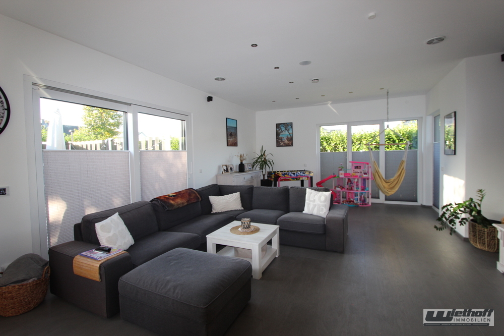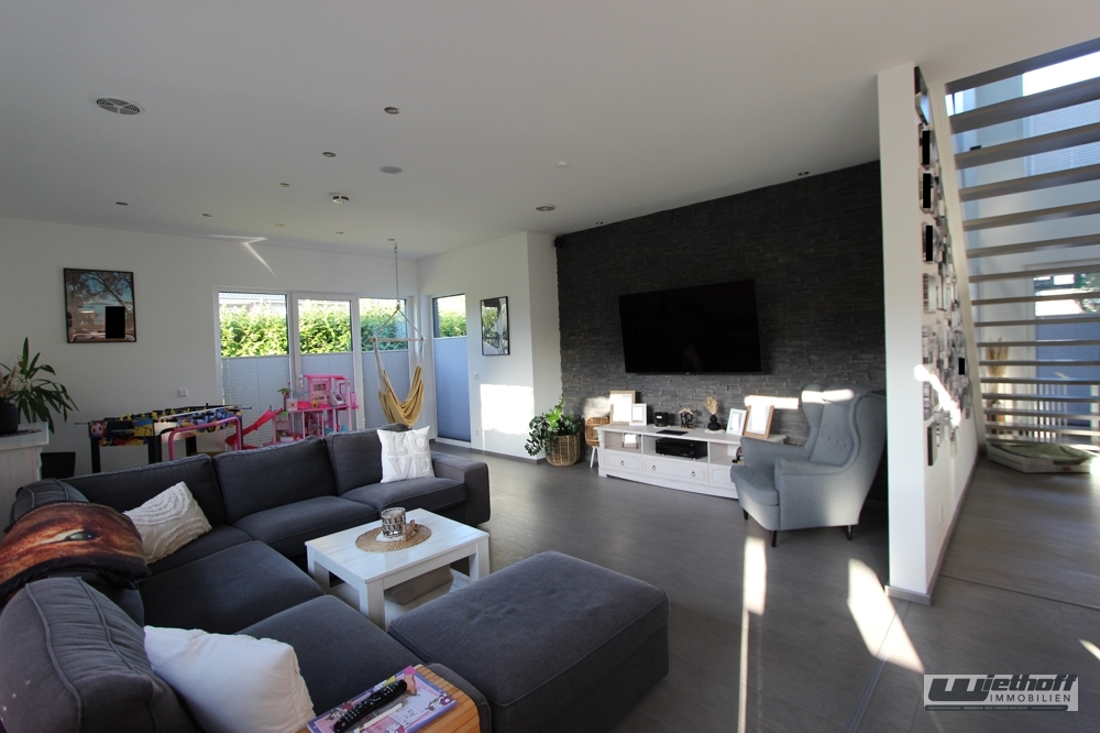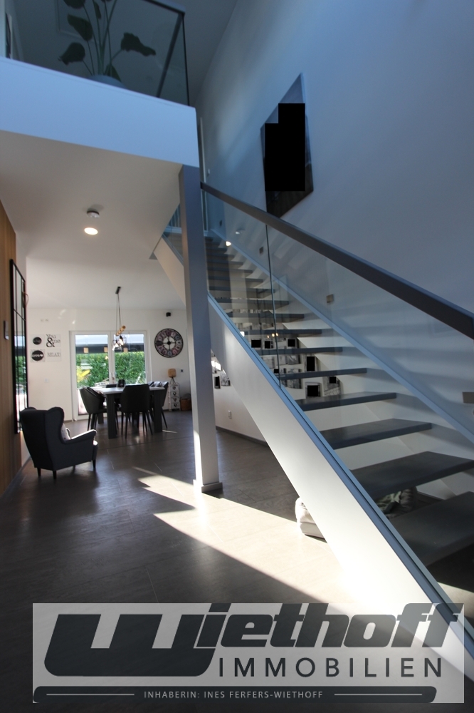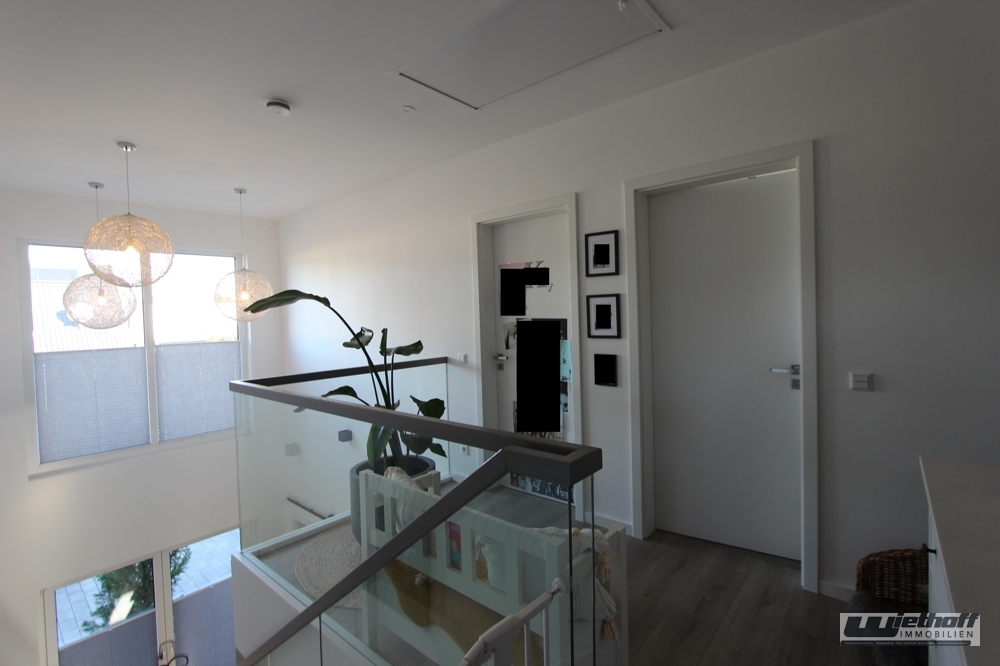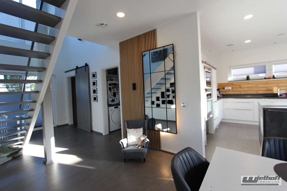 Dieses moderne, freistehende Einfamilienhaus überzeugt durch seine hochwertige Ausstattung, seine energieeffiziente Haustechnik sowie eine durchdachte Raumaufteilung. Errichtet 2017 als Fertighaus in Holzrahmen-/Tafelbauweise mit feuerhemmender Ummantelung und klassischem Ziegeldach, bietet die Immobilie zeitgemäßen Wohnkomfort auf ca. 173 m² Wohnfläche.Die offene Galerie verbindet die zwei Etagen auf elegante Weise und lässt durch ihre großzügige Gestaltung sowie die großen Fenster viel Tageslicht ins Haus strömen. Sie verleiht dem Eingangs- und Wohnbereich eine moderne, repräsentative Atmosphäre.
